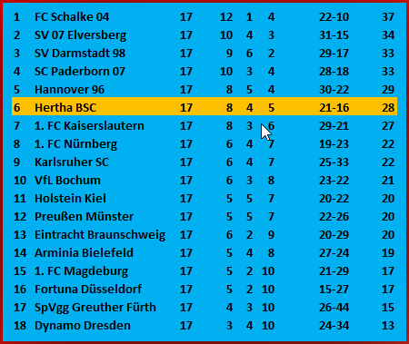 Zum Ende der Hinrunde spielte Hertha BSC gegen Arminia Bielefeld 1:1 Unentschieden. Ein Unentschieden welches als Niederlage bewertet werden muss. Denn mit 28 Punkten haben die Berliner nun satte 6 Punkte Rückstand auf einen direkten Aufstiegsplatz. Das ist viel. Zuviel? In der Rückrunde müssen die Berliner also mindestens zweimal mehr gewinnen als der SV Elversberg, die mit 34 Punkten auf Platz 2 der Tabelle rangieren. Elversberg hat in den 17 Spielen der Hinrunde 10 Siege gefeiert, Hertha nur 8. Und auch Darmstadt und Paderborn holen die Blau-Weißen tabellarisch nur ein, wenn man in der Rückrunde ebenfalls zwei Siege mehr als diese Konkurrenten erringt. Unter zwölf Dreiern in der Rückrunde wird es für einen direkten Aufstiegsplatz sicher nicht reichen. Um also noch aussichtsreich in das Rennen – Aufstieg in die 1. Bundesliga – einzusteigen, müssten insbesondere die 6-Punkte-Spiele gegen diese harte Konkurrenz gewonnen werden. Und an den ersten sechs Spieltagen der Rückrunde treffen die Berliner auf fünf dieser Brocken. Denn mit Schalke, Darmstadt, Elversberg, Hannover und Paderborn dürfen sich die Herthaner gleich mit den fünf Mannschaften messen, die in der Hinrunde besser punkteten. Sollten die Berliner viele dieser so eminent wichtigen 6-Punkte-Spiele gewinnen, dann lebt der Traum vom Aufstieg, sonst …